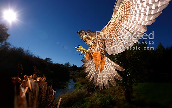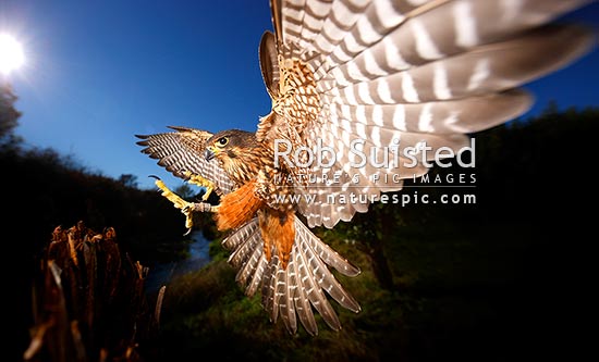 New Zealand Falcon Falco novaeseelandiae; Falconidae flying and landing at high speed